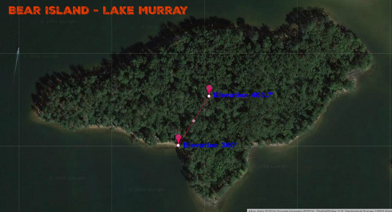 Bear Island is a beautiful island. I've done a good bit of research on this beautiful island. It is 16 acres in size and rises from 360 feet elevation to a maximum elevation of 403.7 feet above sea level in just 260 feet distance (the shortest route). That's an elevation grade of about 16.8% - fairly steep. The island was likely named by Ed Fetner - Lake Murray's first cartographer.